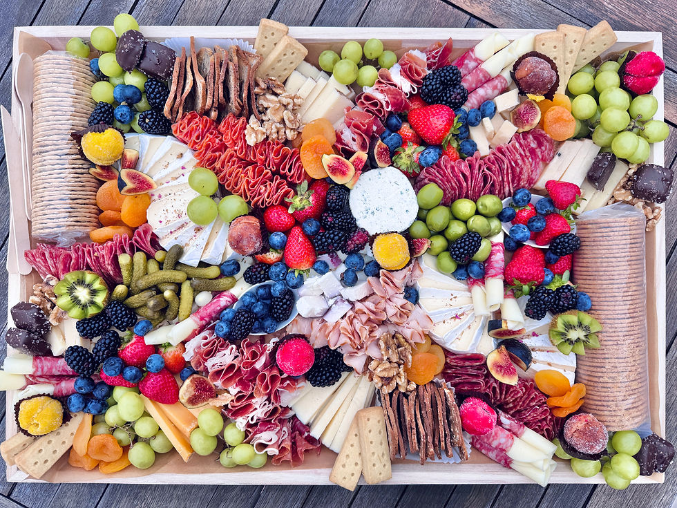 Offerings INCLUDE artisanal cheeses, cured meats, fresh fruits, dip & Veggies, breads & crackers, pickled veggies, dried fruit & nuts